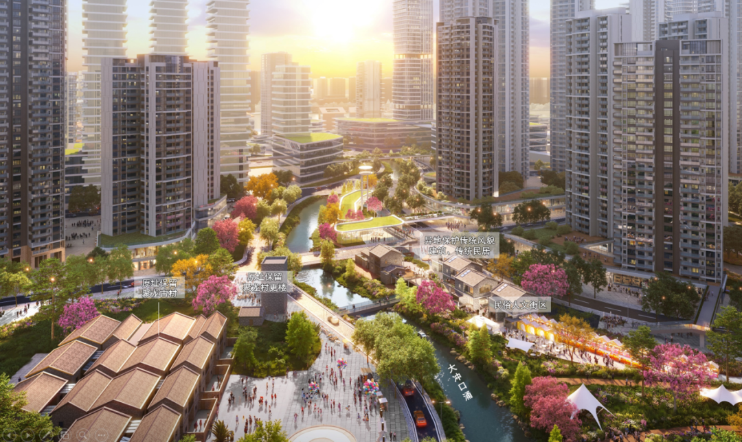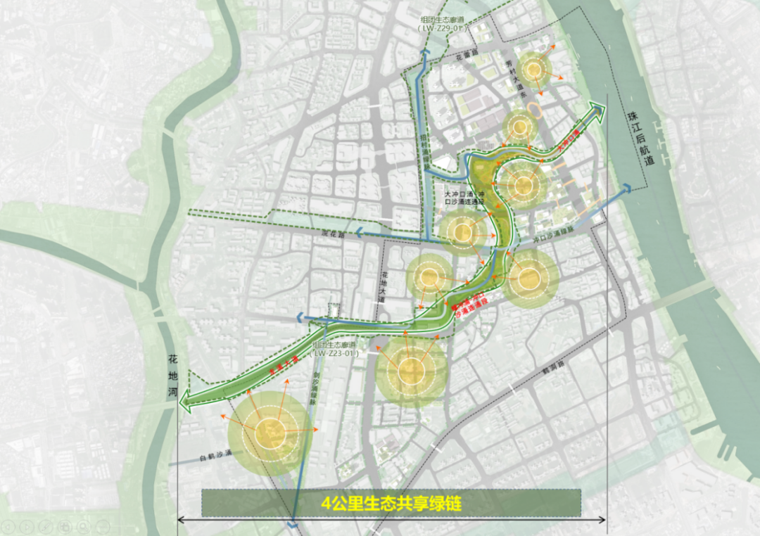 规划注重保护片区内的大冲口涌等历史环境要素,充分利用具有价值特色的建构筑物和传统风貌建筑,整体营造岭南水乡的独特韵味,再现“桥街水市,船埠码头”的胜景。沿共享绿链、珠江、河涌等蓝绿空间,结合民俗文化、工业遗产要素,打造具有本土特色的百年民俗人文径和多元文化创新复合的百年工业遗产径。